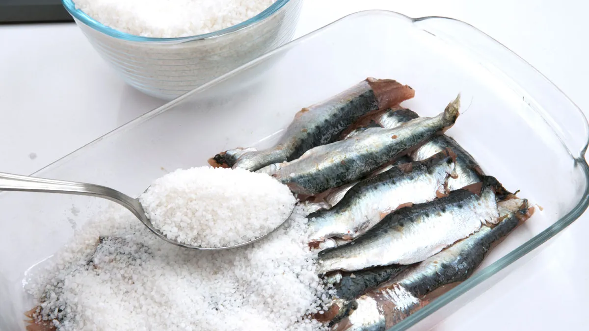 Cubre las sardinas con otra capa de sal gorda y coloca más sardinas encima. Repite la operación hasta colocar todas las sardinas, finalizando con una capa de sal gorda.