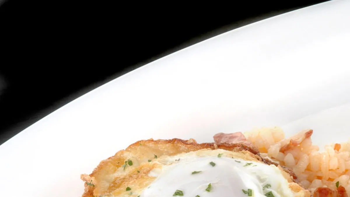 Receta de arroz acompañado de huevo frito, panceta, dátiles y plátano. Este plato es una versión del conocido como arroz a la cubana.