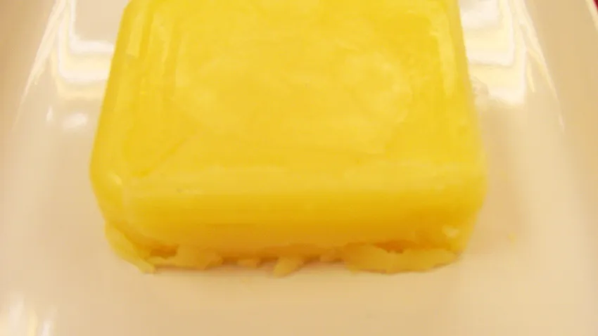 Entonces es cuando colamos el conjunto, y, al enfriarse, la cera queda en un bloque que se puede retirar sin dificultad. Con el líquido resultante es con lo que se monta el helado.