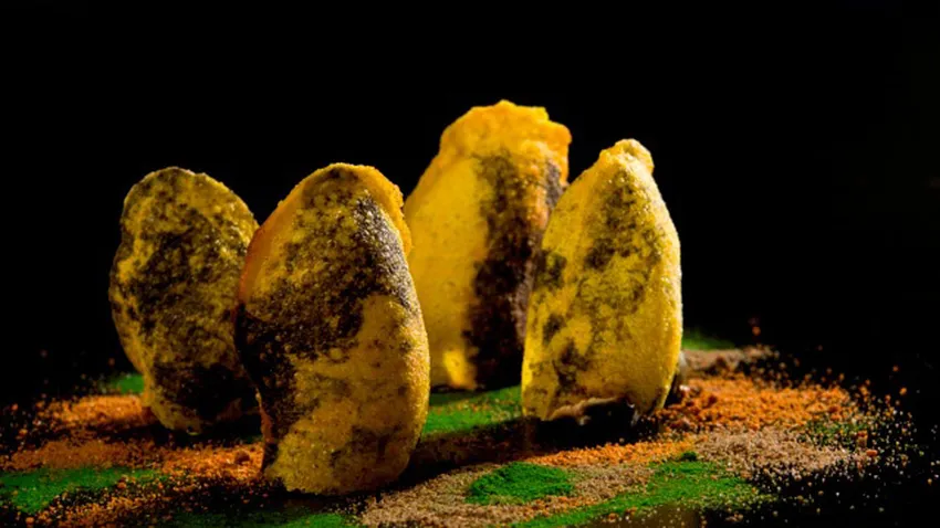 Para el crómlech: Mezclar la mitad de la sémola junto con el caldo de cúrcuma. Amasar el conjunto durante 5 minutos. Dejar reposar 10 minutos la masa. Repetir la misma operación con el resto de la sémola y el caldo de tinta de chipirón. Una vez hayan reposado las masas unir en una bola de 2 gr. de cada una de ellas sin que se mezclen los colores. Estirarla de manera muy fina entre dos hojas de plástico rígido. Freír la masa estirada a 220 Cº realizando movimientos circulares en el cazo según se va friendo durante 40 segundos y a continuación dejar reposar en un aceite de oliva a 149 Cº durante 2 minutos. Escurrir bien y sazonar.