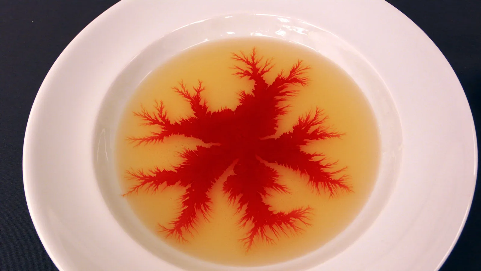Dicho así no parece fácil de entender, pero si lo vemos, lo vamos a entender muy rápido. Se vierte un poco del líquido rojo en el centro del plato sobre el otro. Los dos líquidos tienen distinta temperatura y distinta densidad. Como se ha dicho, enseguida empieza a formarse el fractal.