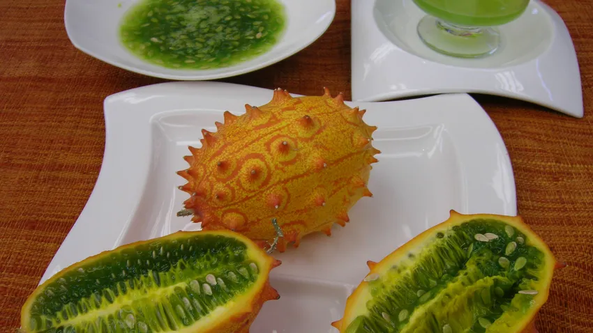 Su cáscara está cubierta de espinas carnosas y su pulpa es gelatinosa y está repleta de pepitas. Su piel es muy gruesa, pero no es comestible. Tiene color amarillo con manchas anaranjadas, mientras la pulpa gelatinosa es de un color verde vidrioso y muchas pepitas. En cuanto a su tamaño y su peso, el kiwano tiene una longitud de 10 centímetros aproximadamente y un peso de 200 gramos.
