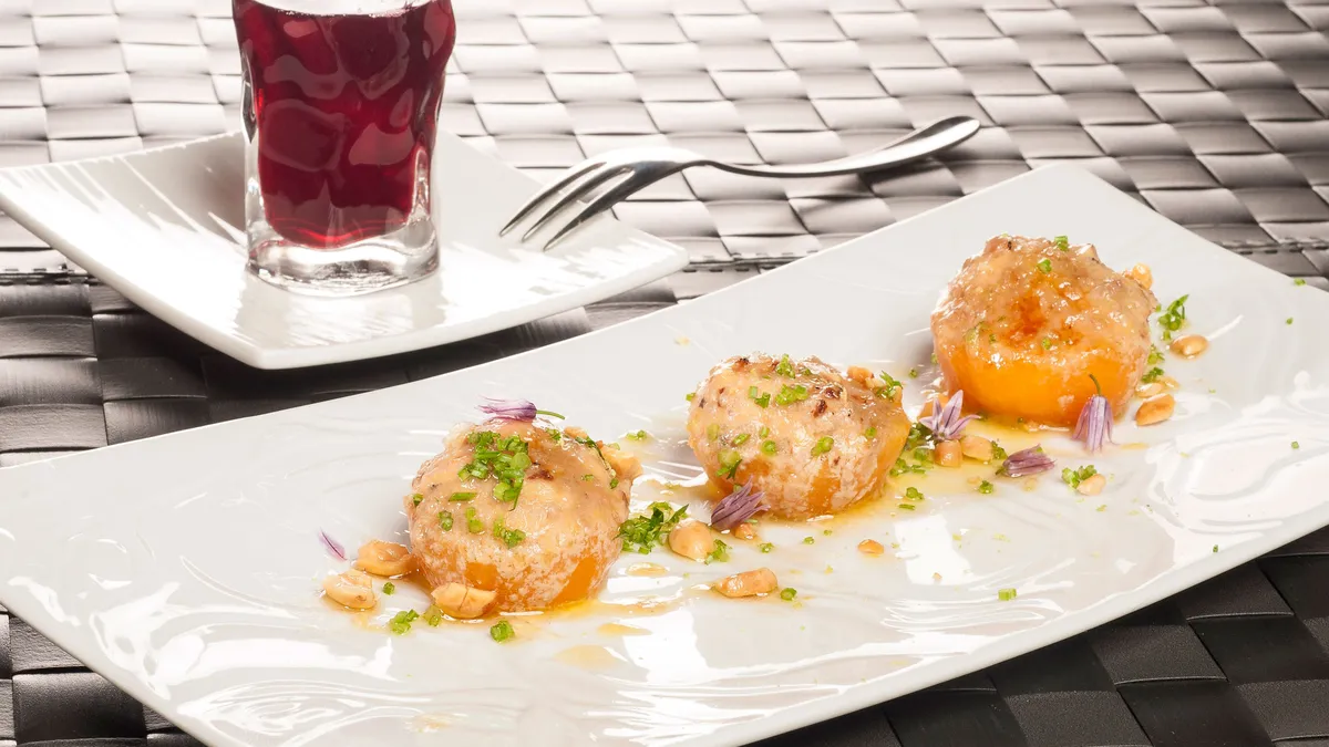 Bruno Oteiza propone un aperitivo diferente de albaricoques rellenos de cacahuete y mousse de foie y queso caramelizado. Para acompañar, un vasito de agua de Jamaica preparada a base de flor de hibiscus.