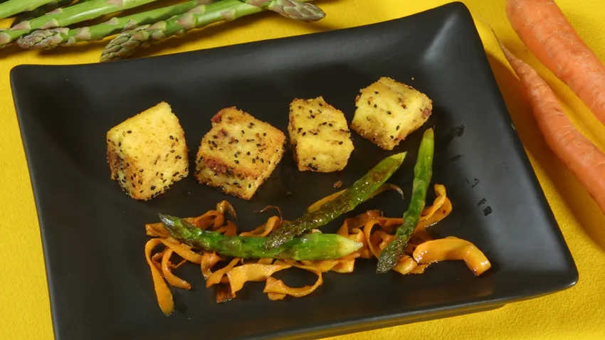 Cubre una bandeja de cristal con papel de aluminio. Extiende la polenta y déjala enfriar. Córtala en cuadraditos, pásalos por la mezcla de pan rallado y semillas de sésamo y fríelos en una sartén con aceite.