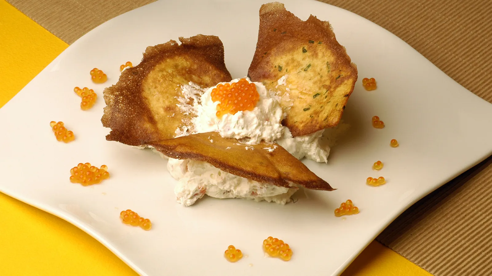 Receta de Karlos Arguiñano, un aperitivo a base de crepes fritos con un relleno de trucha ahumada, eneldo y huevas de trucha.