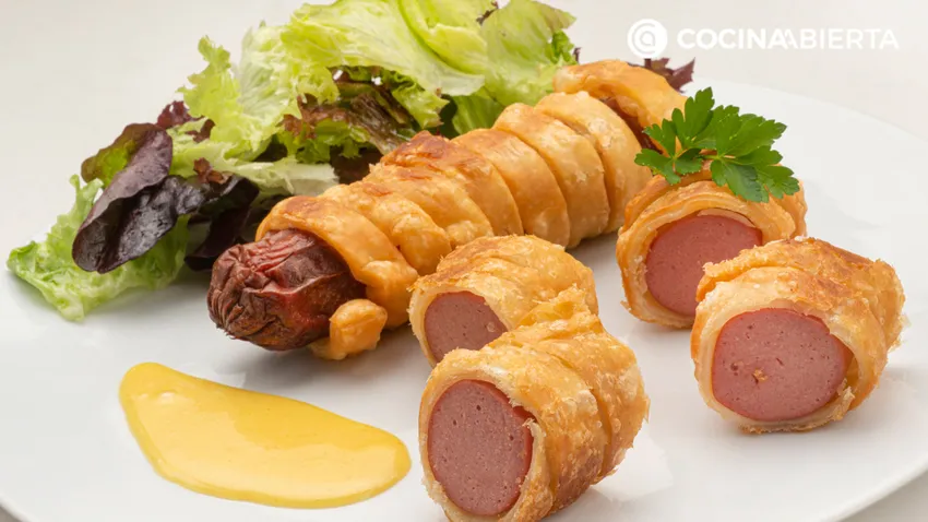 La salchicha de Frankfurt tiene su origen lógicamente en Alemania y se caracteriza por su sabor suavemente ahumado y después de una larga selección de carnes de cerdo. A su vez utilizaremos hojaldre para envolver las salchichas, una de las masas más conocidas que se utilizan en repostería y que es perfecta tanto para platos dulces y como salados.
