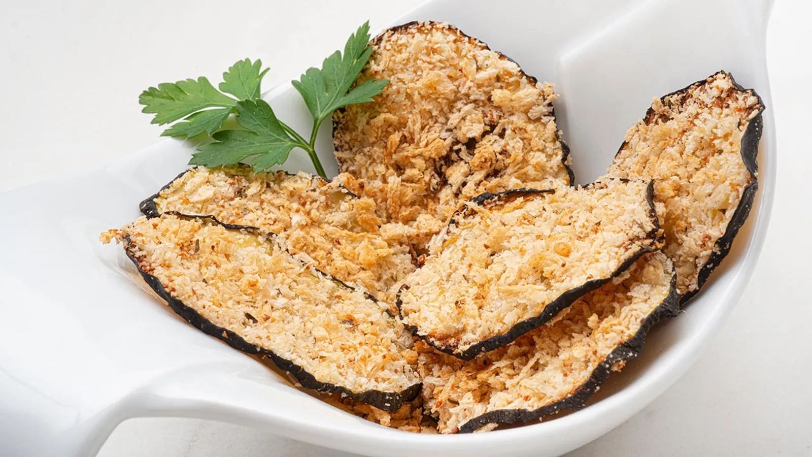 Sirve el calabacín crujiente en 4 platos, sazona y decora los platos con unas hojas de perejil. Puedes disfrutar de estos chips de calabacín solos o acompañarlos con alguna de estas deliciosas salsas.