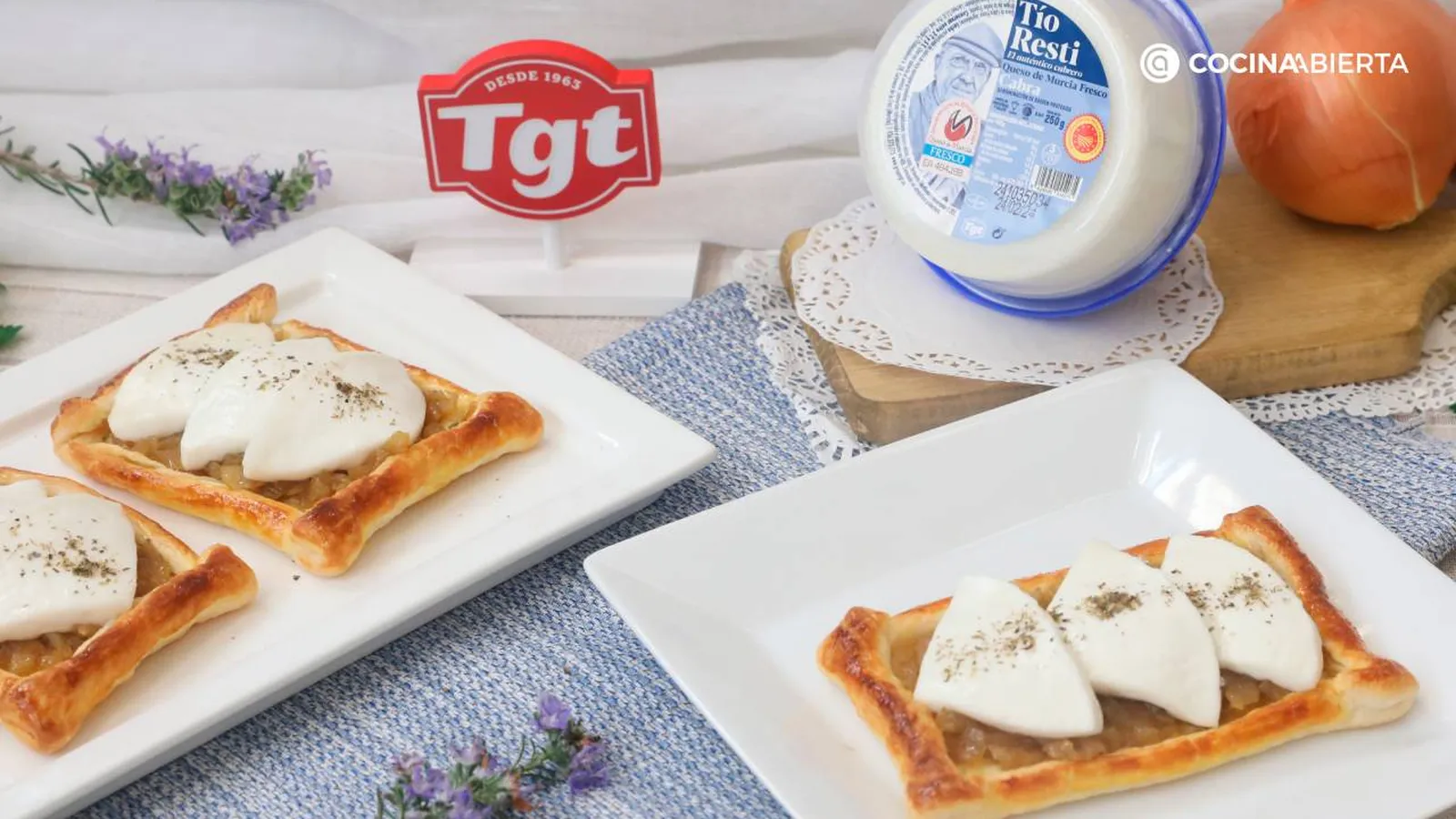 Saca los hojaldres del horno y cubre cada canapé con cebolla caramelizada y tres porciones de queso de cabra Tío Resti de TGT.