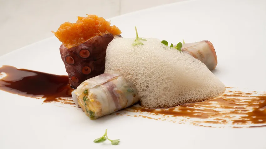 Canelón de tuétano y ostra con pulpo