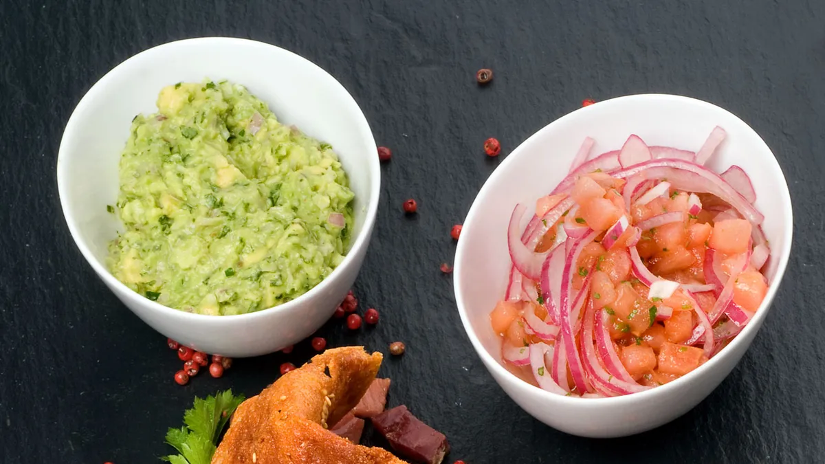 Receta de chicharrón de queso tostados con dos salsas, guacamole y salsa "pico de gallo" y jamón serrano en taquitos. Un plato delicioso e ideal para el aperitivo, propuesto por Enrique Fleischmann