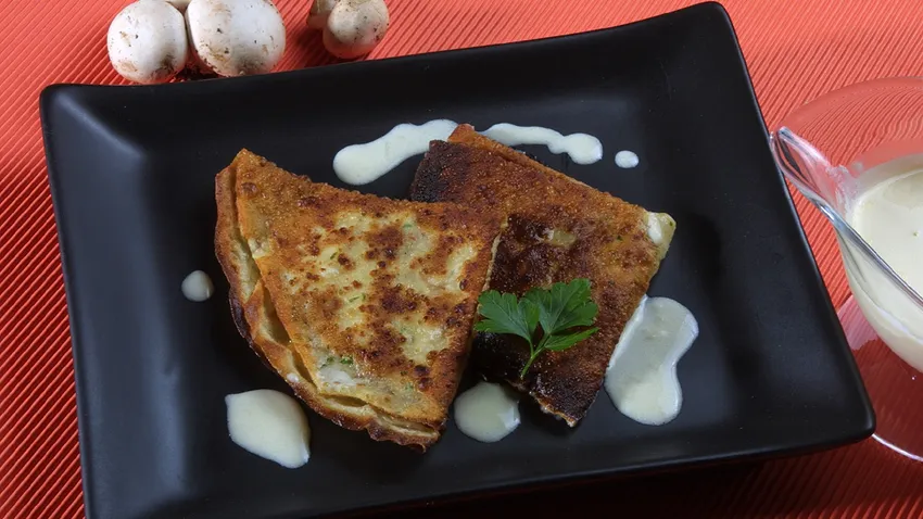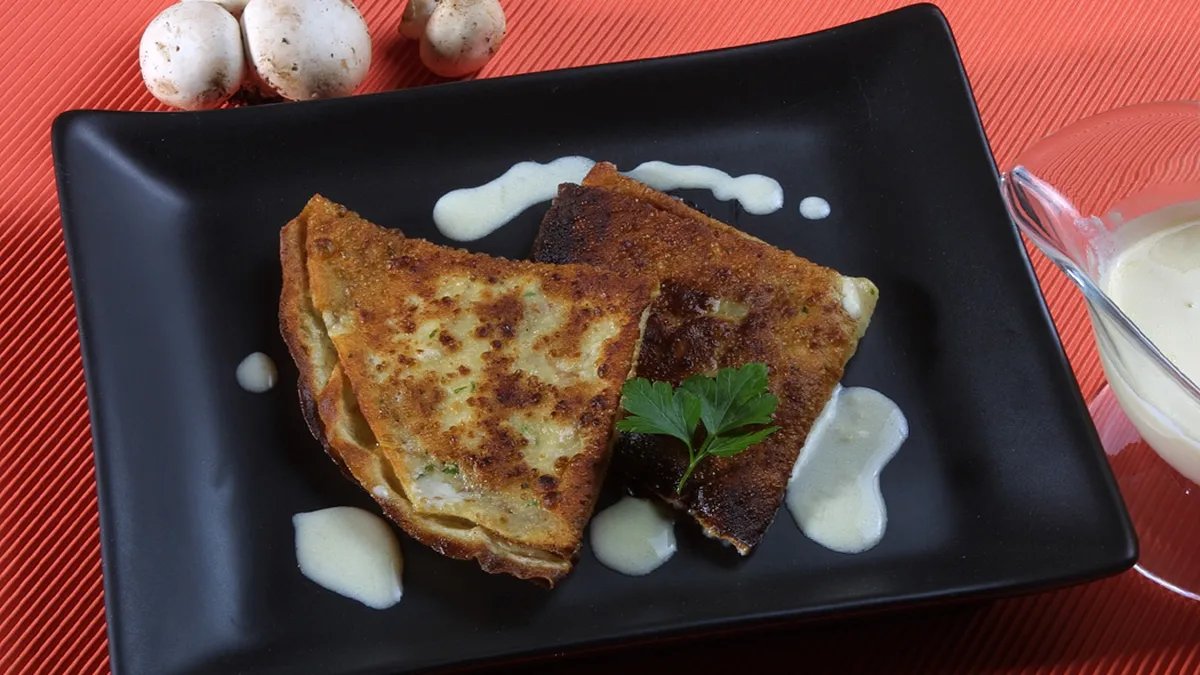 Deliciosa receta de crepes rellenos de champiñones y queso servidos con una sencilla salsa de queso. Receta de Karlos Arguiñano.