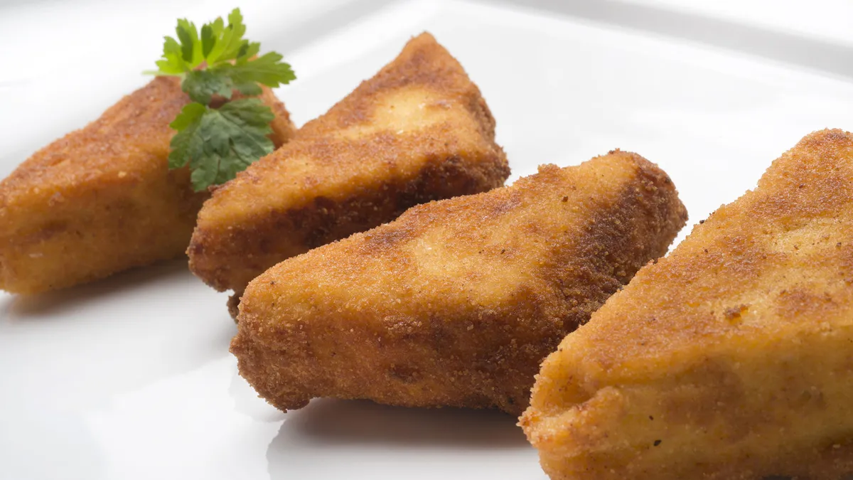 Saca la masa del recipiente y córtala en triángulos. Pásalos por harina, huevo batido y pan rallado. Pon a calentar abundante aceite en una sartén, agrega los triángulos y fríelos. Escúrrelos sobre un plato forrado con papel absorbente de cocina.