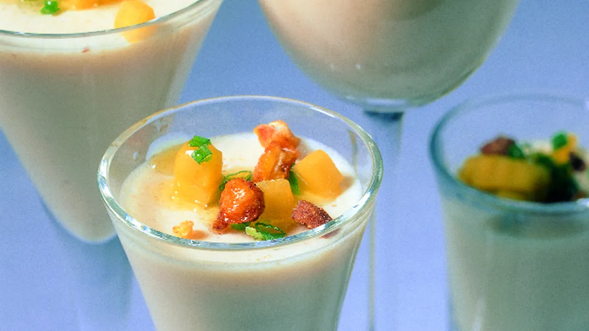 Juan Mari Arzak propone un original aperitivo: cuajada de foie gras con mango y maíces crujientes.