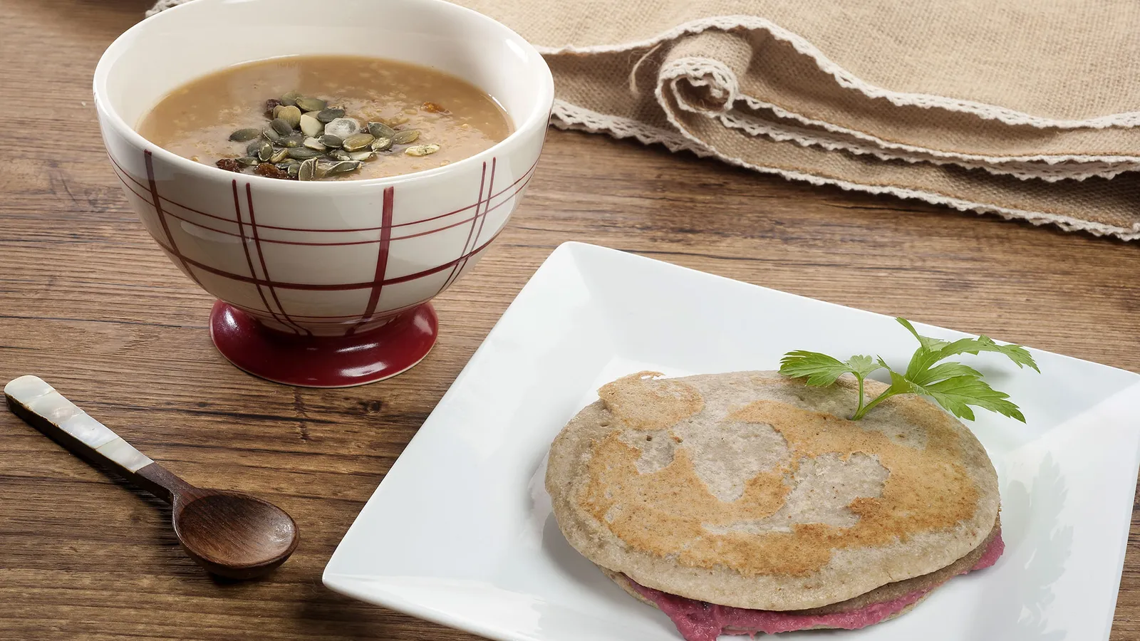 Zuhaitz Izarra prepara un desayuno macrobiótico de crema de arroz, mijo, orejones y canela y propone unas tortitas de trigo sarraceno rellenas de hummus de remolacha para comer a media mañana.