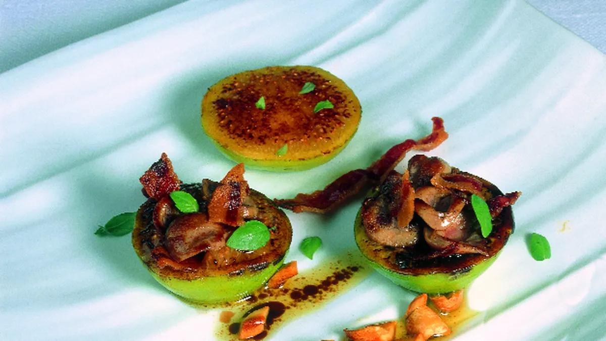 Receta de alta cocina: Higos a la plancha con riñones, queso del Roncal, tocino crujiente y vinagreta de cacahuetes elaborada por Juan Mari Arzak.