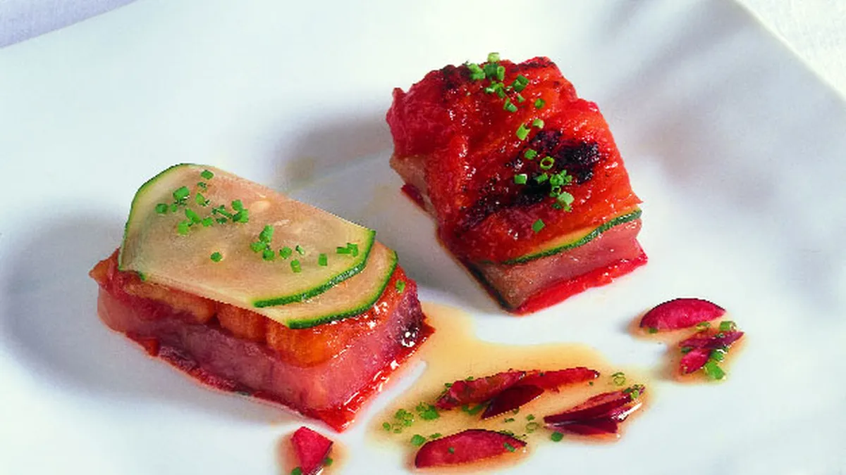 Receta de Milhojas de atún y piquillos con calabacín, tomate y vinagreta ligera de cerezas elaborada por Juan Mari Arzak.