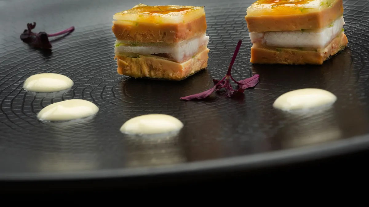 Milhojas caramelizado de foie gras, anguila ahumada, cebolleta y manzana