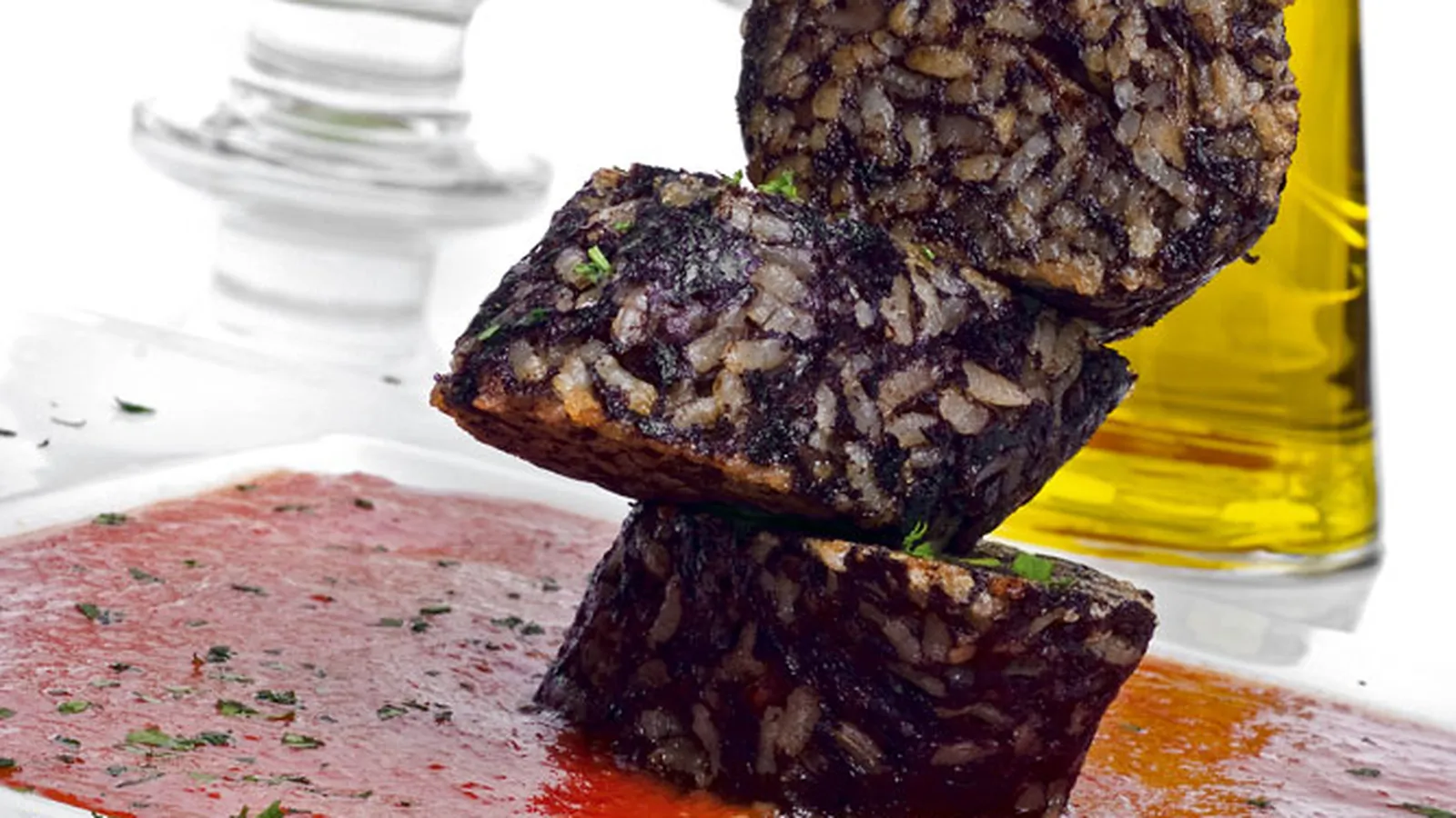 Morcillas de arroz con tomate, un embutido sin carne, relleno con sangre, verduras, arroz u otros ingredientes. Es un alimento muy extendido que se puede encontrar en muchos países, en esta ocasión acompañado por salsa de tomate.