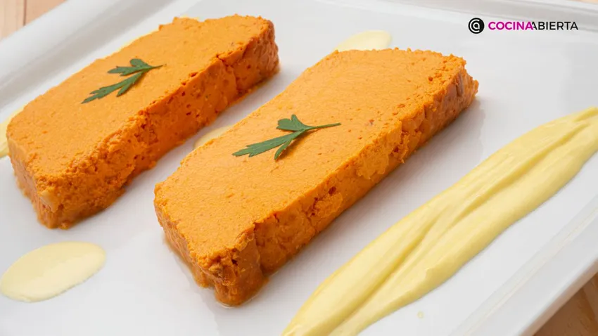 Basta con mezclar y triturar todos los ingredientes, colocar la crema en un molde y hornear a 40-45 ºC. Luego, deja que se temple para poder cortarlo; quedará muy tierno. Acompáñalo con mahonesa.