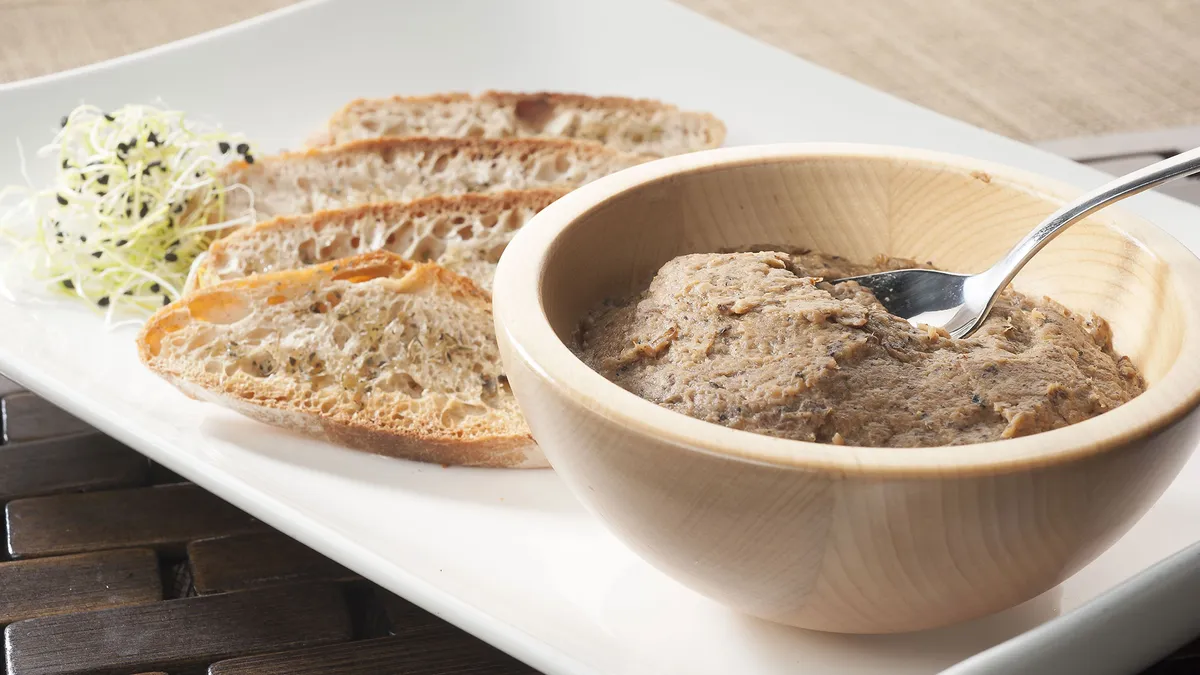 Receta de paté vegetal de shitake y cebolla caramelizada acompañado de panes tostados al aceite y orégano, un entrante de la cocina macrobiótica de la mano de Zuhaitz Izarra.