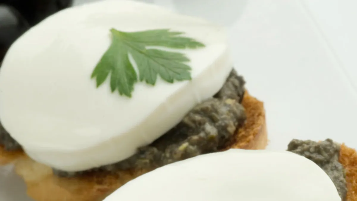 Un aperitivo a base de queso fresco y una salsa de aceitunas negras sobre unas tostadas de pan.