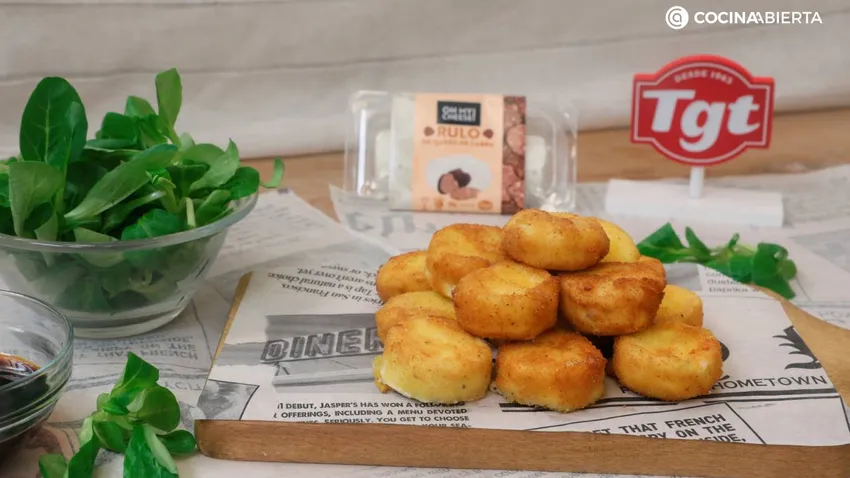 Sirve el queso de cabra frito. Aquí te propongo acompañarlo con canónigos para darle un toque verde y con salsa de soja prueba a untarlos, ¡están deliciosos!