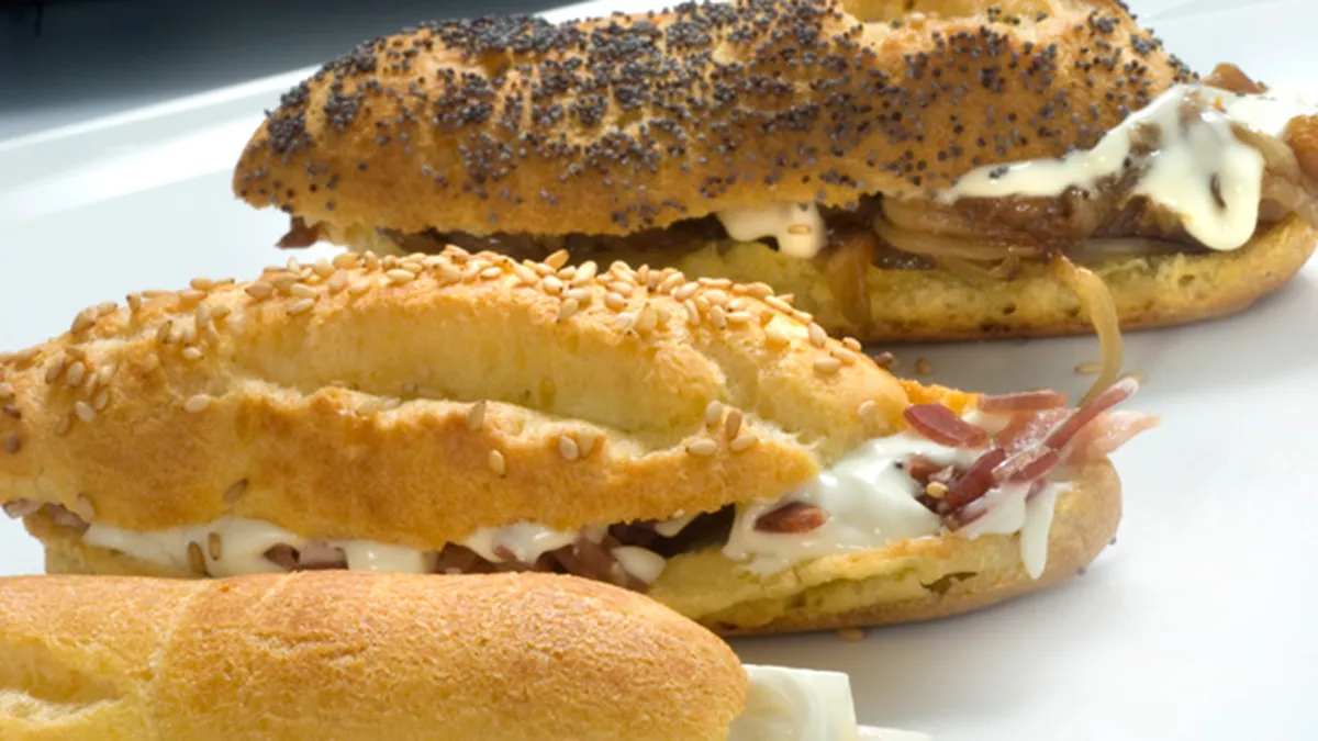 Coloca un trozo de papel de horno sobre una bandeja para horno y extiende la masa en forma de doce buñuelos alargados. Esparce por encima de 4 las semillas de sésamo y por encima de otros 4 las semillas de amapola. Hornea a 220ºC durante 20-25 minutos (con el horno precalentado). Deja atemperar. Reserva.