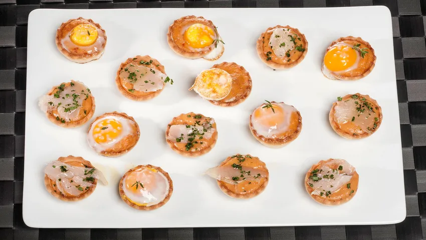 Bruno Oteiza prepara un original aperitivo de tartaletas de pasta brisa rellenas de crema de patatas a la riojana con bacalao ahumado y huevo de codorniz gratinado.