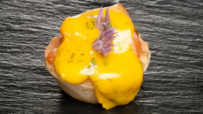 Bruno Oteiza prepara un aperitivo de tartaletas de pasta brisa rellenas de salmón marinado y cubiertas de salsa holandesa.