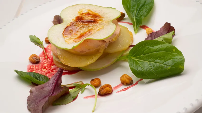 El hecho de acompañarse con patata y manzana, hace que el tamaño de la ración de foie gras sea menor haciendo el plato más saludable y equilibrado que si sólo comemos el foie gras.