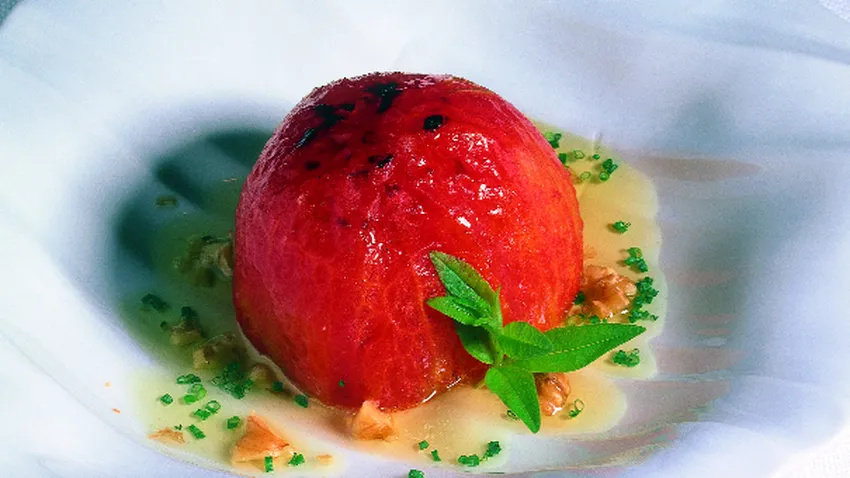 Receta de tomate relleno de queso ahumado y vinagreta de nuez con cecina crujiente elaborada por el gran chef Juan Mari Arzak.