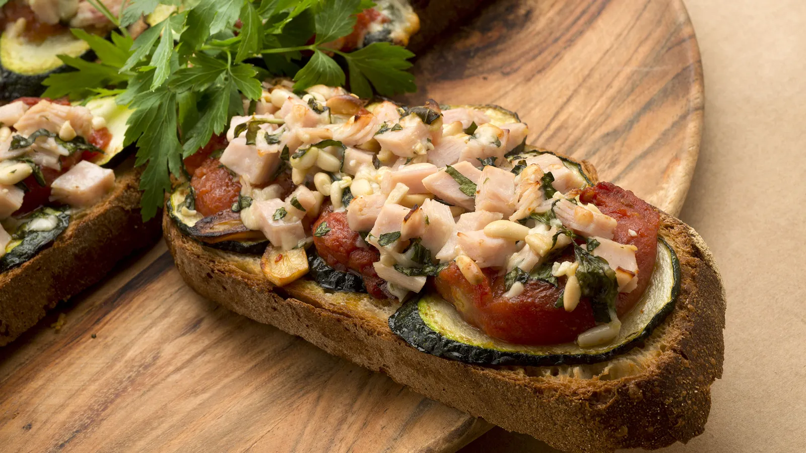 Coloca las tostas en una placa de horno, cúbrelas con las lonchas de calabacín, con los tomates con los ajos y con el pesto con pavo. Gratínalas en el horno. Sirve y decora con una ramita de perejil.