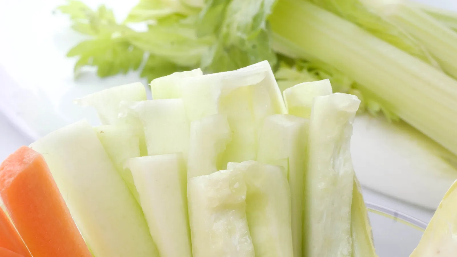 Pela y corta el pepino por la mitad. Retírale las pepitas y córtalo en bastones. Corta la zanahoria en bastones finos. Corta las ramas de apio por la mitad a lo largo y a lo ancho.