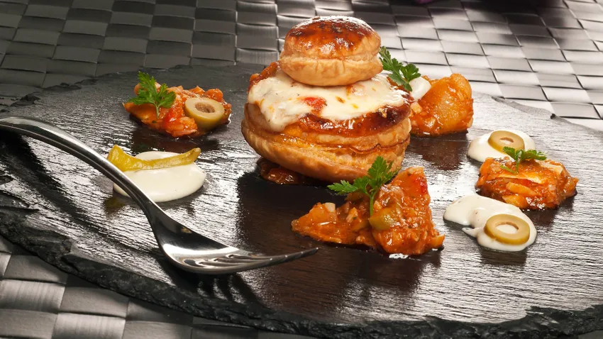 Receta de Bruno Oteiza de volovanes caseros de hojaldre rellenos de bacalao ajoarriero con guindillas y aceitunas y cubiertos con bechamel y queso de oveja gratinado. Este plato es ideal para servir como entrante en Navidad.