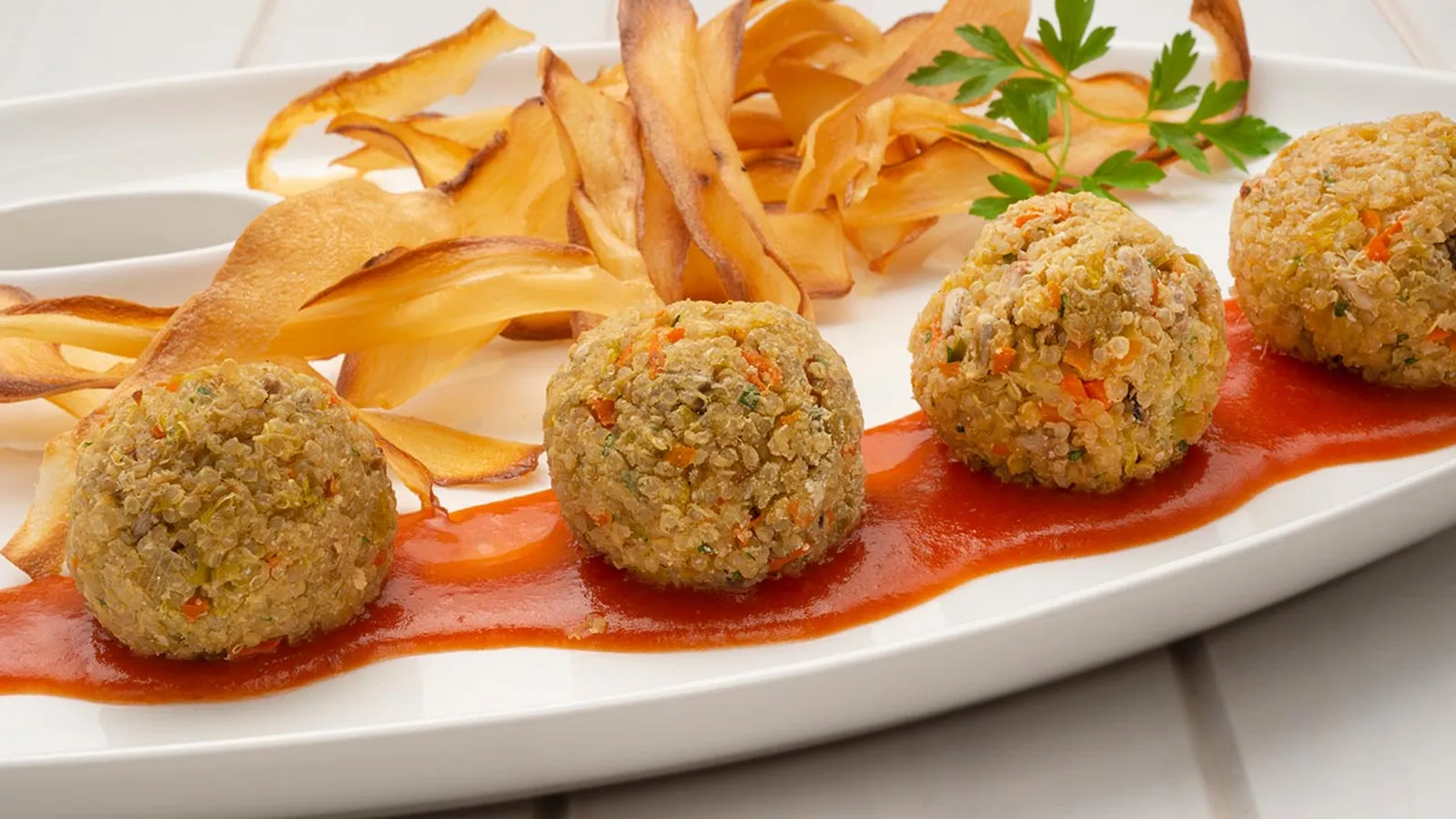 Albóndigas de quinoa con chips de yuca, una opción vegana