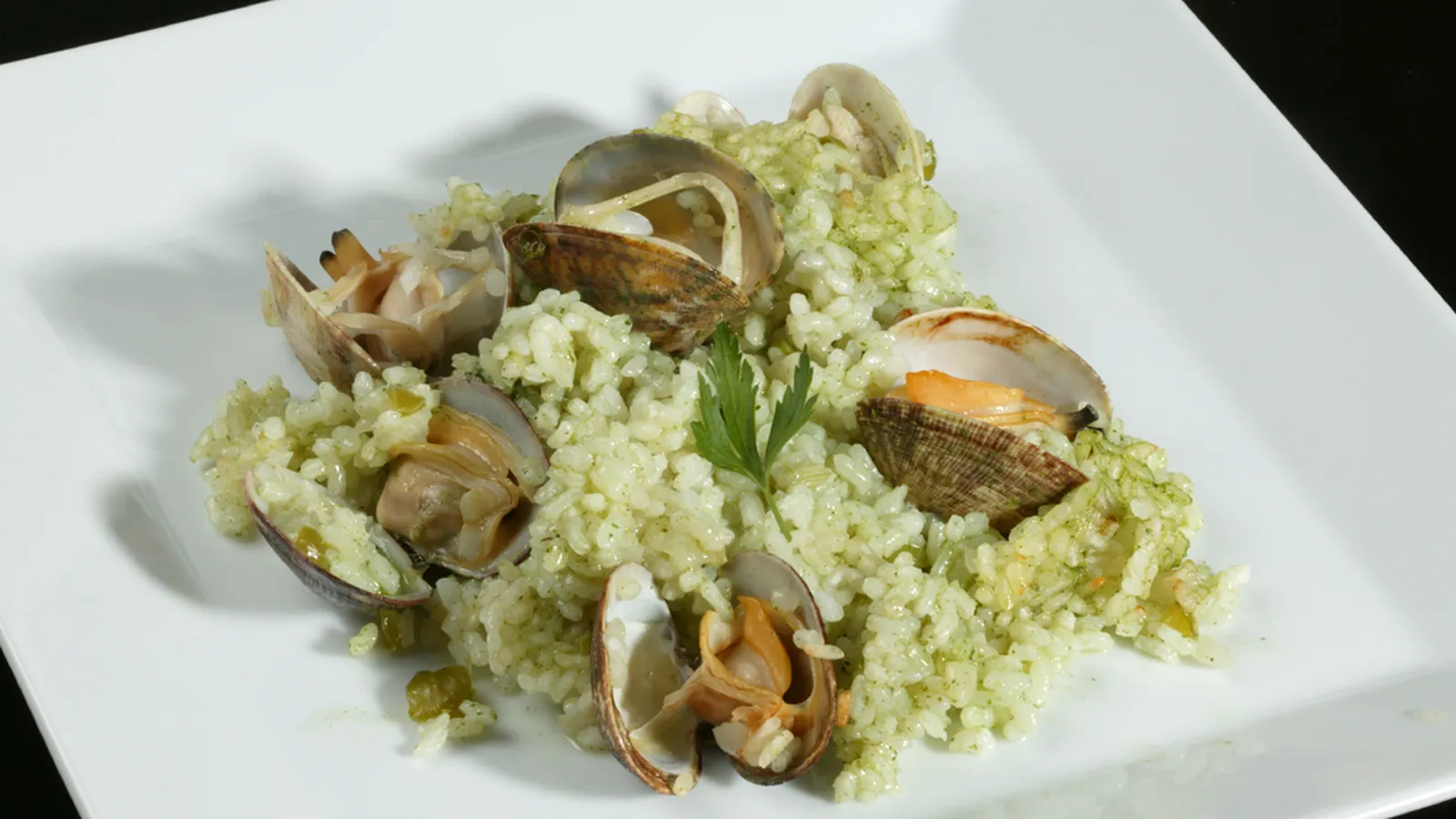 Arroz con almejas y jugo de perejil
