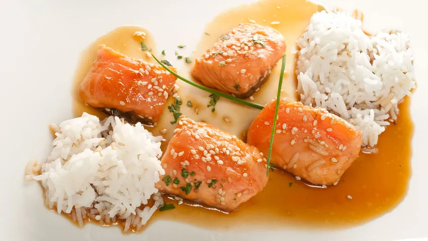 Receta de Bruno Oteiza de arroz basmati acompañado de salmón frito con salsa teriyaki casera, un plato con el que sorprender a tus invitados.