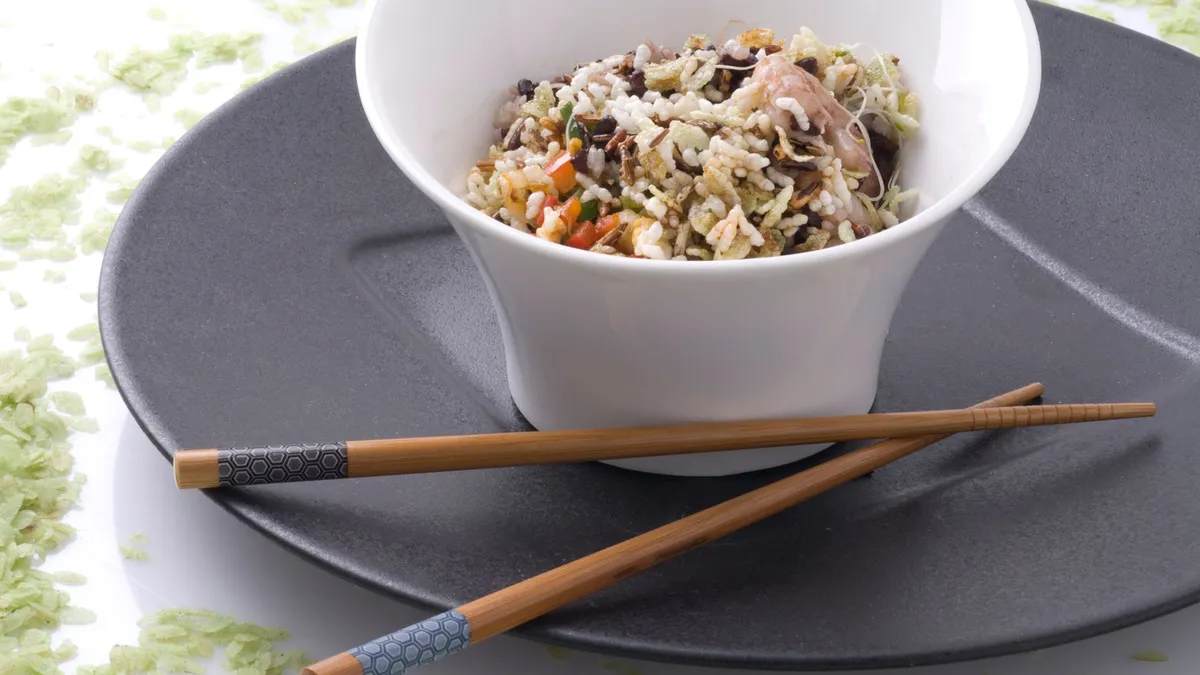 Arroz de colores con salsa agridulce, una receta asiática con una pinta estupenda y elaborada por el cocinero Enrique Fleischmann.