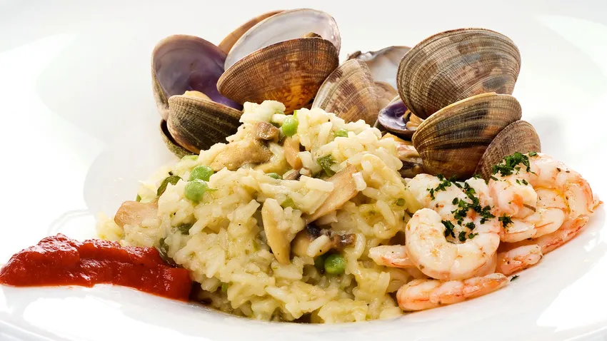 Arroz cremoso con almejas, champiñones y gambas