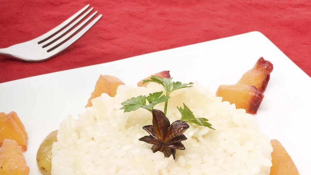 Coloca en cada plato un cortapastas cilíndrico y pon el arroz en la base. Aplasta con una espátula y desmolda. Esparce alrededor del arroz las frutas en escabeche. Vierte por encima la reducción de las frutas y decora con el anís estrellado y una ramita de perejil. Sirve el arroz con frutas en escabeche.