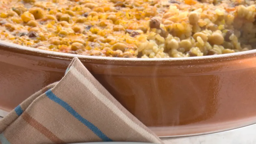 Pica el ajo y el tomate. Ponlo a pochar en una cazuela con un chorrito de aceite durante unos 7-8 minutos. Añade el arroz y las pasas. Rehoga durante 6-7 minutos, agrega el azafrán y el pimentón. Vierte el doble de caldo que de arroz, mezcla todo bien y deja hervir unos 4-5 minutos. Añade los garbanzos y perejil picado. Mezcla e introduce en una cazuela de barro. Hornea a 200º C durante unos 15-20 minutos y sirve.