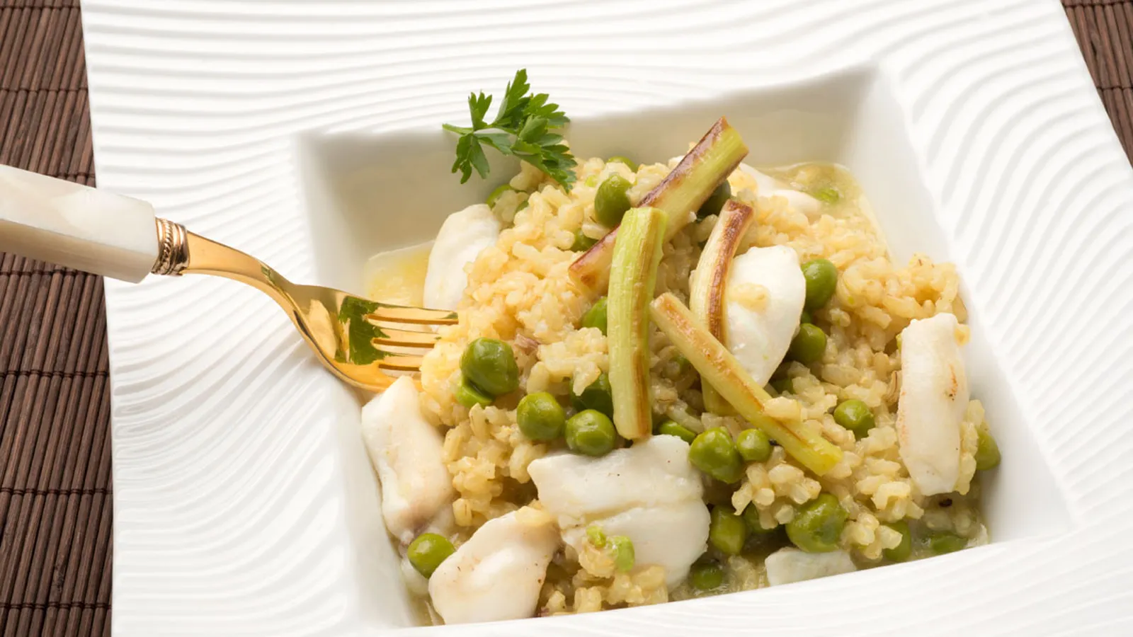 Receta de Karlos Arguiñano de arroz integral con guisantes, rape, ajos frescos y chalotas al curry, un plato saludable y fácil de preparar.