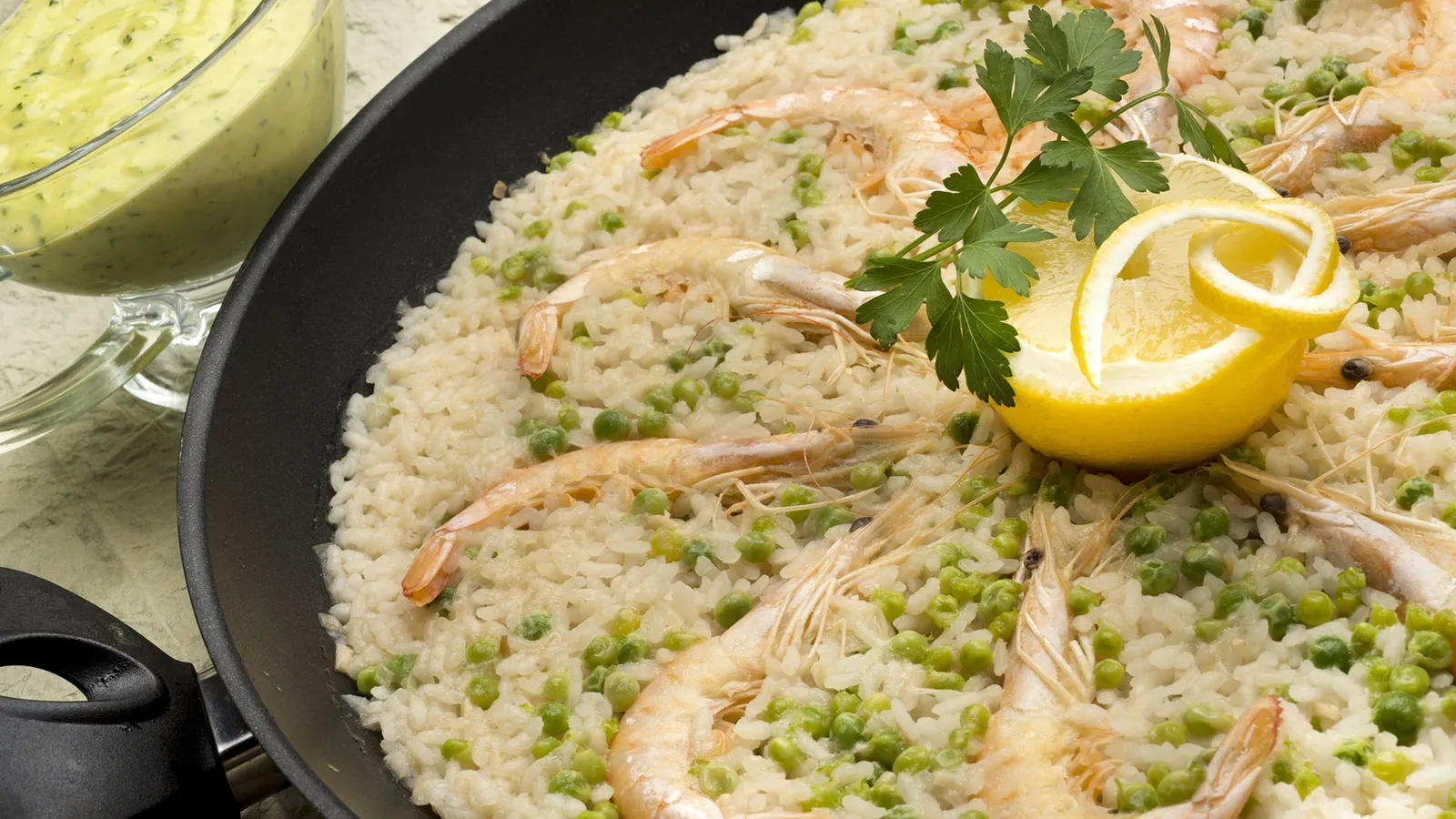 Karlos Arguiñano prepara un plato de arroz con langostinos, guisantes y alioli casero de perejil.
