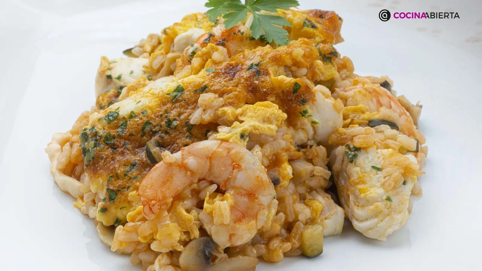 Calienta una sartén con 2 cucharadas de aceite. Sazona los langostinos y los dados de merluza, añádelos a la sartén y saltéalos brevemente. Retira y extiéndelos sobre el arroz. Bate los huevos en un bol, viértelos sobre el arroz y espolvoréalos con un poco de perejil picado. Hornéalo a 220ºC durante 8 minutos.