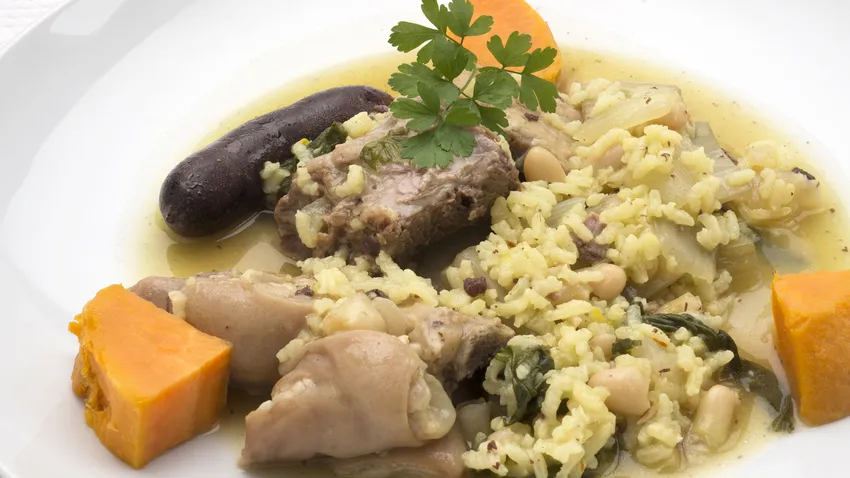 Karlos Arguiñano elabora la receta de arroz en perol, un plato tradicional de la zona cercana a La Albufera (Valencia) a base de arroz, verduras, alubias, cerdo, pato y en ocasiones, boniato.