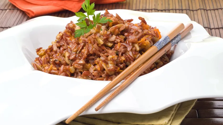 Receta de arroz rojo con calabaza, champiñones y nueces elaborada por Eva Arguiñano en el programa Hoy cocinas tú.