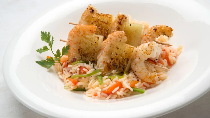 Receta de Karlos Arguiñano de arroz thai con verduras y jengibre salteados en el wok acompañado de brochetas de langostinos y melón cocinados a la plancha.