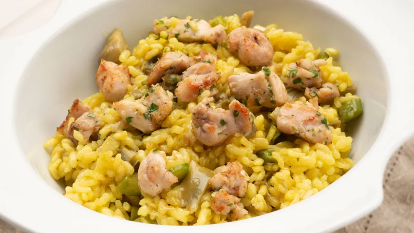 Arroz con verduras y conejo al azafrán