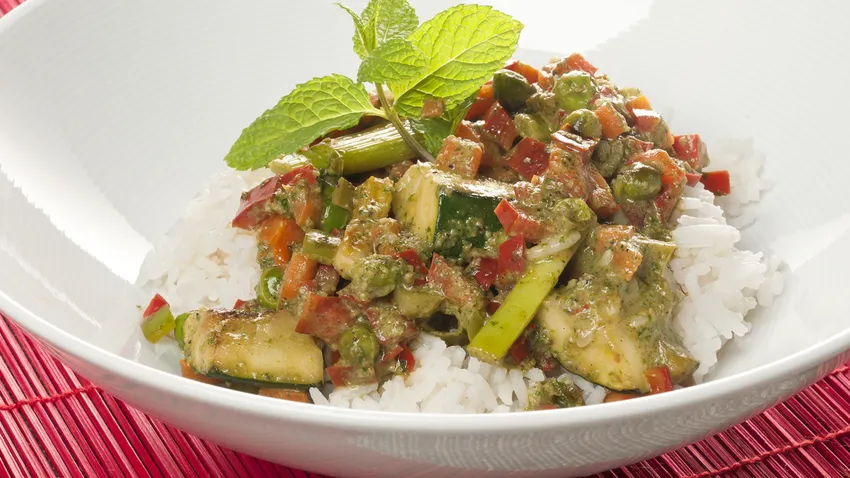 Sirve el arroz sobre un plato y añade encima las verduras. Cubre con el curry verde y decora con unas hojas de menta.