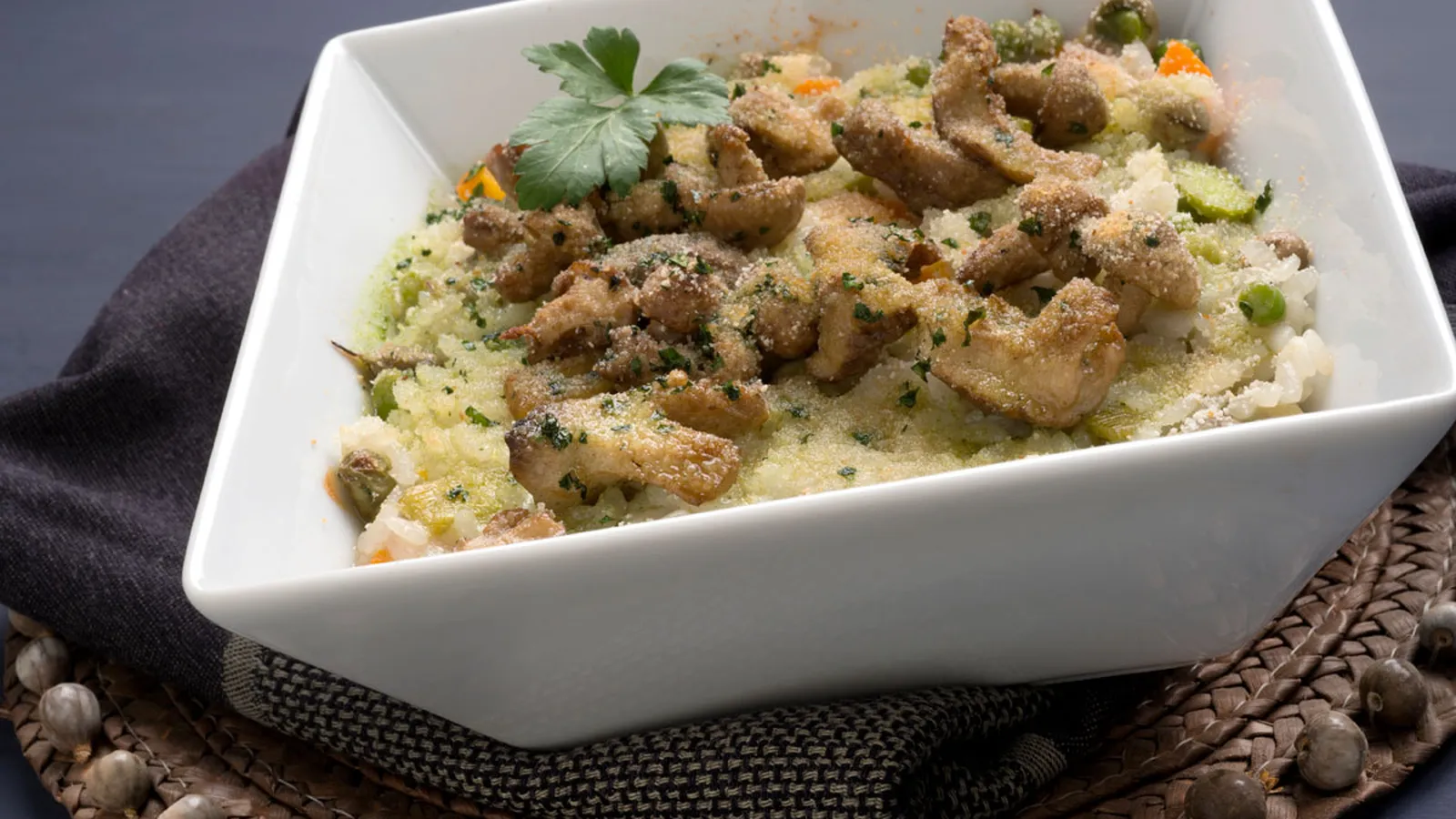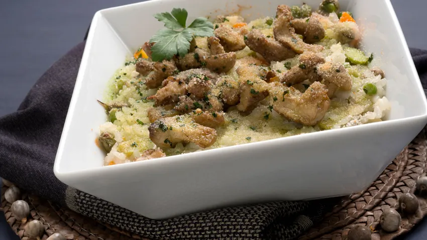 Arroz con verduras de primavera al gratén
